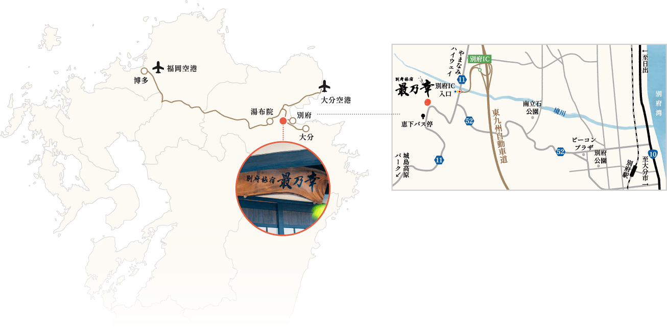 別府ICよりお車で約1分。JR日豊本線別府駅からは「恵下」バス停にて下車、徒歩約1分の好アクセスです。