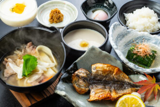 朝食はだんご汁や温泉たまごなど、体に優しい和の味わいをどうぞ。