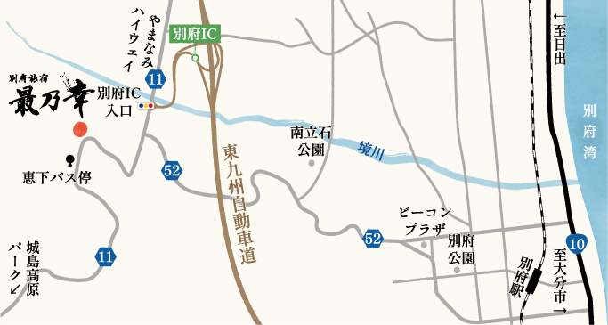 - 大分ICから東九州自動車道で別府ICまで約11分。別府ICから当館まで約1分で到着。