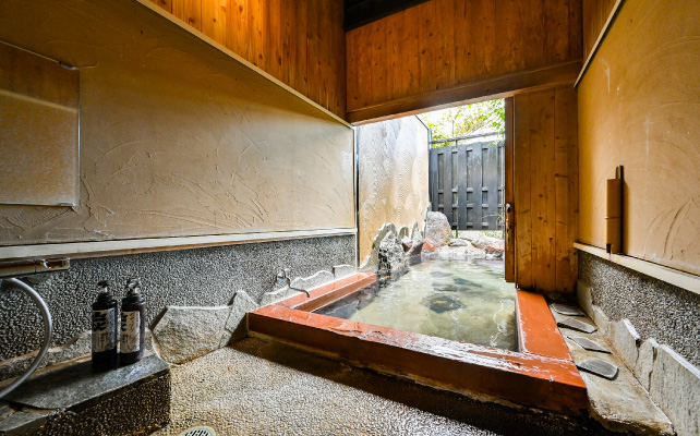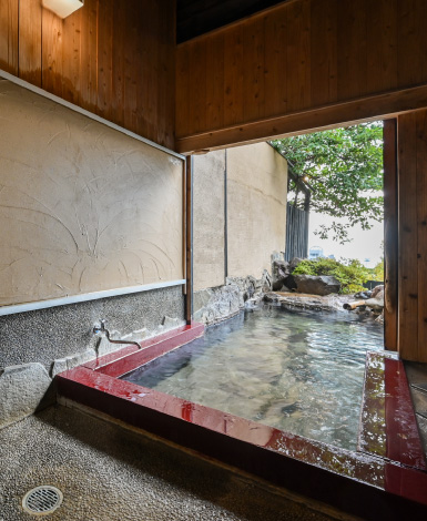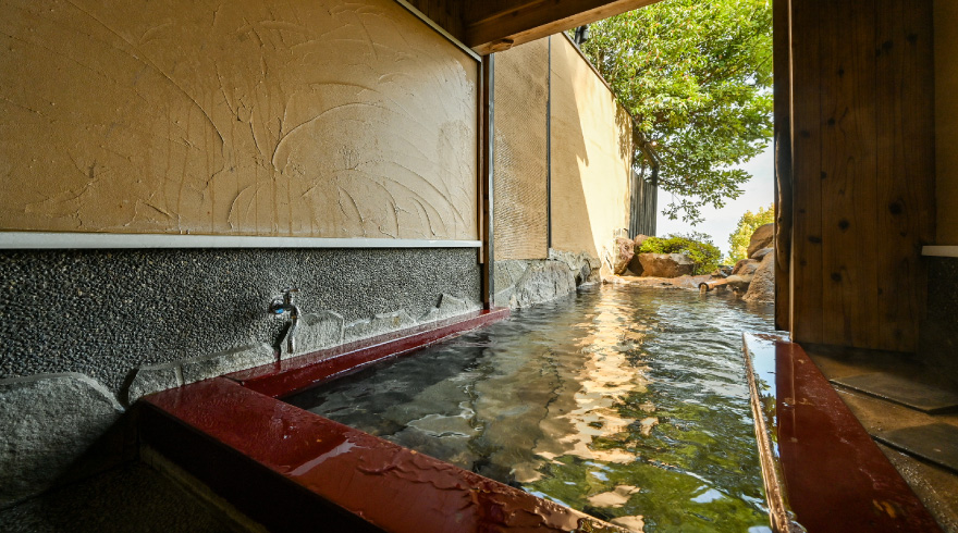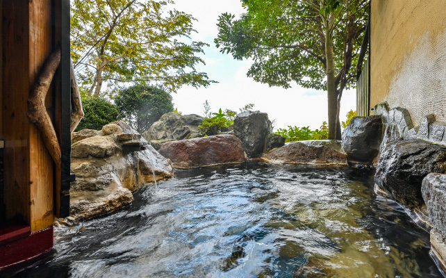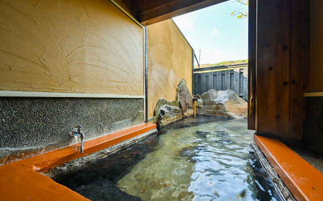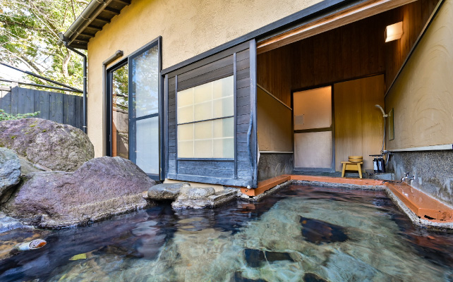 炭酸水素塩泉のトロリとした肌触りが心地よく、全客室に内湯と露天風呂を完備。